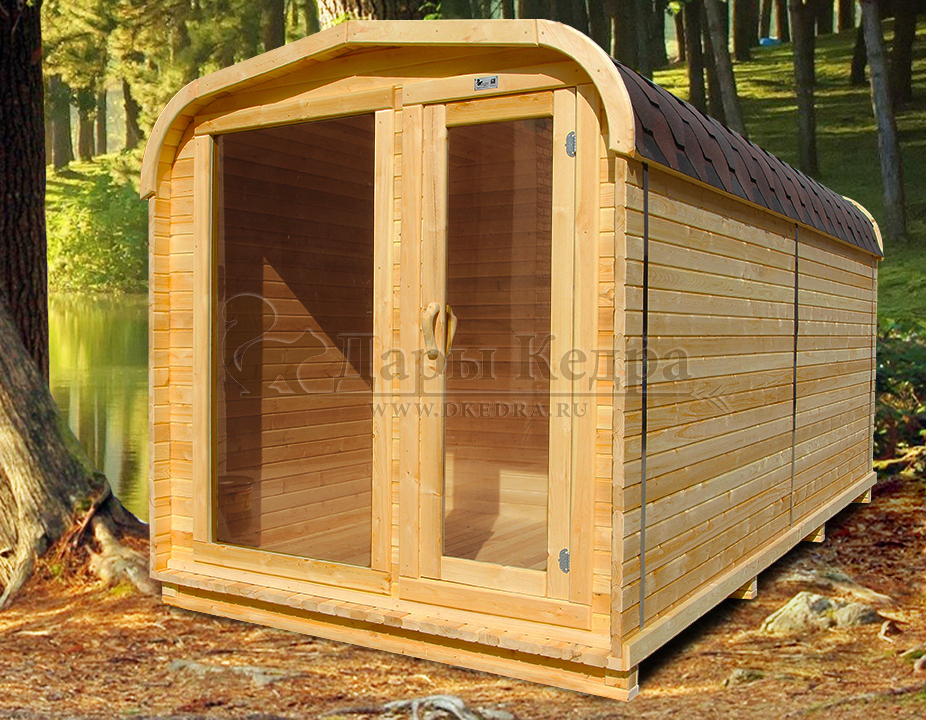 Баня-бочка круглая из кедра 3 метра Это изделие круглой вытянутой формы с двумя отделениями: раздевалкой и парной. Лавочки из кедра находятся по всей длине бани-бочки с обеих сторон. Печь расположена в парилке около дальней стены. Для удобства пользования в раздевалке установлена вешалка и полочка из кедра. За счет небольшой конструкции баня нагревается не более 30 минут. По вашему желанию баню-бочку можно дополнить печью с внешней загрузкой, благодаря которой весь мусор после топки останется на улице. Круглая баня-бочка не требует полноценный фундамент, поэтому при необходимости ее можно перенести в другое место. Обращаем Ваше внимание, что в стандартную комплектацию бани входят лавки в парной с обеих сторон. Дополнительно можно заказать полок открытого или закрытого типа! Кедр обладает ароматическими свойствами. Он не деформируется и влагоустойчив, при правильном уходе за деревом на нем не развиваются грибки и плесень.