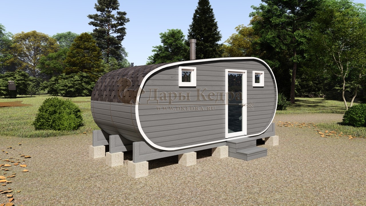 Баня-бочка буханка из кедра 3 метра Это более просторная модель за счет увеличенной высоты потолков и ровного пола. В такой модели раздевалка совмещена с моечной. Тут установлен душевой поддон, вешалка, полочка и лавочка из кедра. В парильном отделении по обе стороны расположены двухуровневые открытые полки, печь находится между ними у дальней стены. Время растопки такой бани не превышает 30 минут. По вашему желанию баню-бочку можно укомплектовать козырьком, верандой и печью с внешней загрузкой, благодаря которой весь мусор во время топки остается на улице. Баня-бочка буханка не требует полноценный фундамент, поэтому при необходимости ее можно перенести в другое место. Обращаем Ваше внимание, что в стандартную комплектацию бани входят полки открытого типа в парной с обеих сторон. Дополнительно можно заказать полок закрытого типа или лавку! Кедр обладает ароматическими свойствами. Он не деформируется и влагоустойчив, при правильном уходе за деревом на нем не развиваются грибки и плесень.