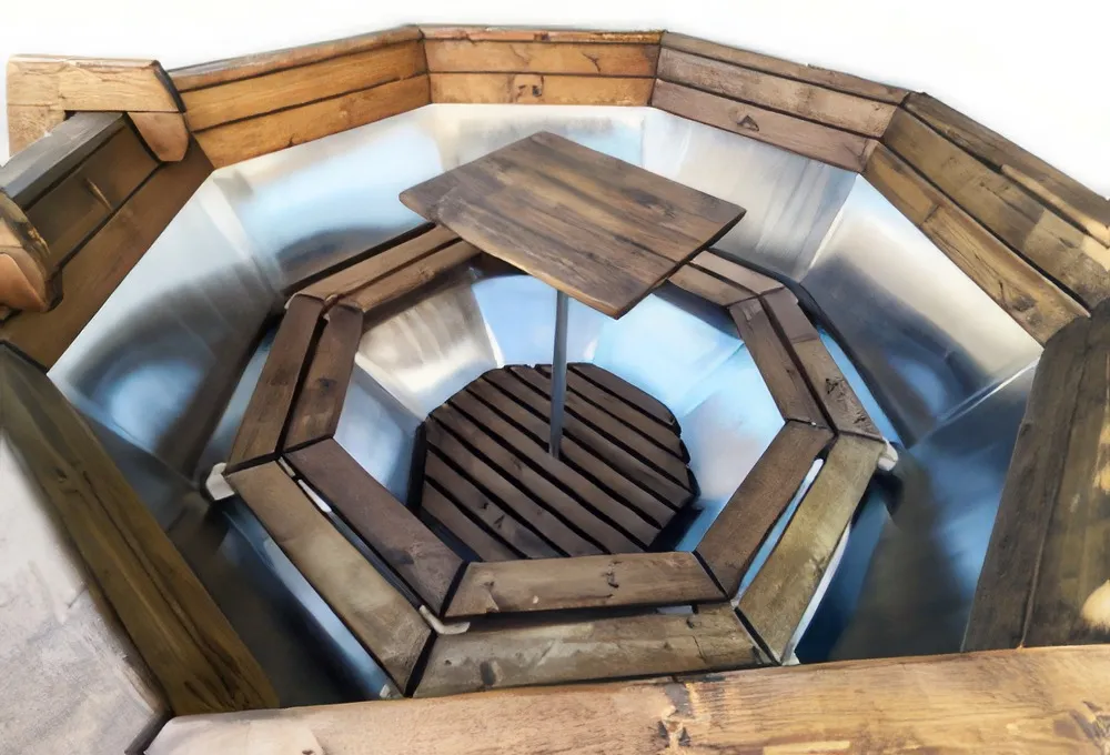 Банный чан с ветрозащитой изготовлен из пищевой стали. Представляет собой большую ёмкость в виде чаши, при нагревании которой можно париться на свежем воздухе. Банный чан установлен на металлическую закрытую подставку, которая служит защитой от ветра и печью одновременно. В комплект такой модели входит дымоход 2 метра. Чан оборудован кедровым бортом, скамейками, подспинниками, трапом для ног и приставной лестницей.