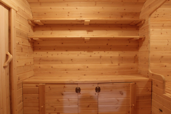 Это изделие круглой вытянутой формы с тремя отделениями: раздевалкой, моечной и парной. Во всех трех отделениях с обеих сторон установлены лавочки из кедра. Печь находится в парилке около дальней стены. Для удобства пользования в бане висят полочки из кедра и вешалка в раздевалке. Время растопки такой бани не превышает 30 минут. По вашему желанию баню-бочку можно дополнить печью с внешней загрузкой, благодаря которой весь мусор после топки останется на улице. Круглая баня-бочка не требует полноценный фундамент, поэтому при необходимости ее можно перенести в другое место.