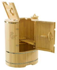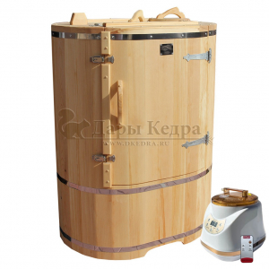 Готовый комплект - это полностью укомплектованный набор с фитобочкой для процедур парения. Овальная модель более просторна и удобна в использовании. Толщина стенок составляет 25 мм. Фитобочка оборудована откидными створками, дверцей и отверстием для головы. Во время парения человек сидит внутри кедровой бочки, а голова находится снаружи. Благодаря этому исключается возможность перегрева. Подлокотники из кедра, встроенные ручки на створках и двери делают эксплуатацию более удобной.