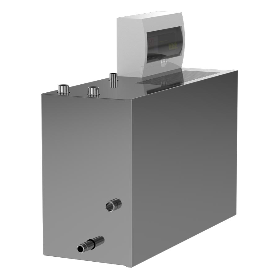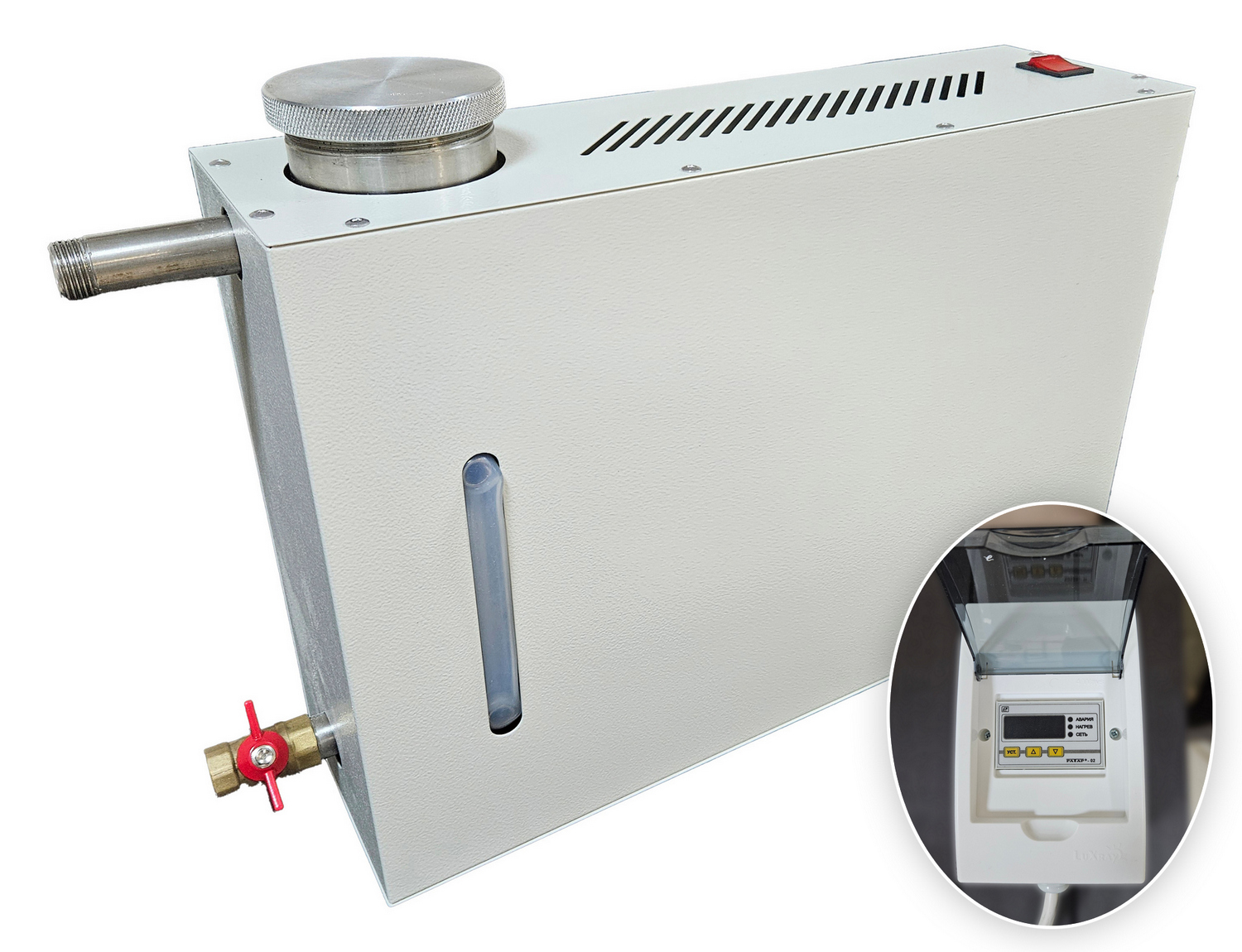 Парогенератор проточный c выносным/встроенным цифровым пультом управления, 9 кВт Проточные парогенераторы подключаются к водопроводу и автоматически добавляют воду в прибор при ее расходовании. Парогенератор служит для образования пара в саунах, хамамах, банях и душевых кабинах. Мощность стоит выбирать в зависимости от объема парной. Работа парогенератора осуществляется за счет встроенного или выносного пульта управления (на ваш выбор). Он позволяет устанавливать температуру, мощность и время процедур парения. При достижении необходимой температуры происходит автоматическое прекращение подачи тепла для нагрева воды. При снижении температуры более чем на 3°С температурный датчик снова включает подогрев. Таким образом время непрерывной работы парогенератора составляет более 12 часов.
