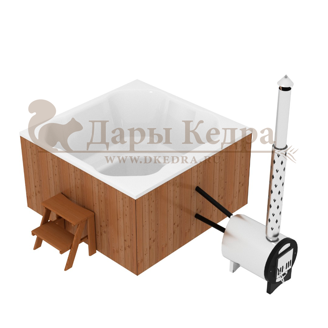 Финская квадратная композитная купель с подогревом (с интегрированной печкой) «кварта интегра 200» Это уличная подогреваемая купель с квадратной внутренней чашей, которая изготовлена из современного прочного и термоустойчивого материала (композита). Форма чаши обеспечивает комфортную посадку во время принятия процедур. Для удобства пользования купель фурако оборудована приставной лестницей. Нагрев воды происходит за счет интегрированной печи, которая встроена под чашу. Композитная вставка придает купели красивый внешний вид, продлевает срок службы и облегчает уход за изделием. Парение на свежем воздухе – это отличный способ укрепить здоровье и поддержать организм в тонусе.